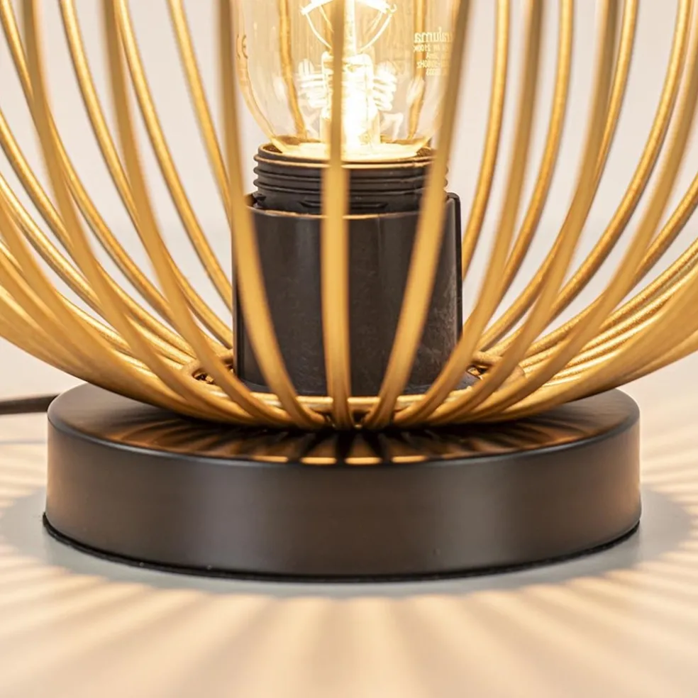 Een leuke trendy tafellamp met een fijne lichtverspreiding. Door de spijlen heeft de lamp een open structuur waardoor er veel licht kan worden verspreid. De tafellamp is gemaakt van metaal en uitgevoerd in het goud met zwart. De gouden spijlen geven de lamp een speelse look. De tafellamp is voorzien van een zwart snoer met een lengte van 185 cm. De lichtbron is exclusief.