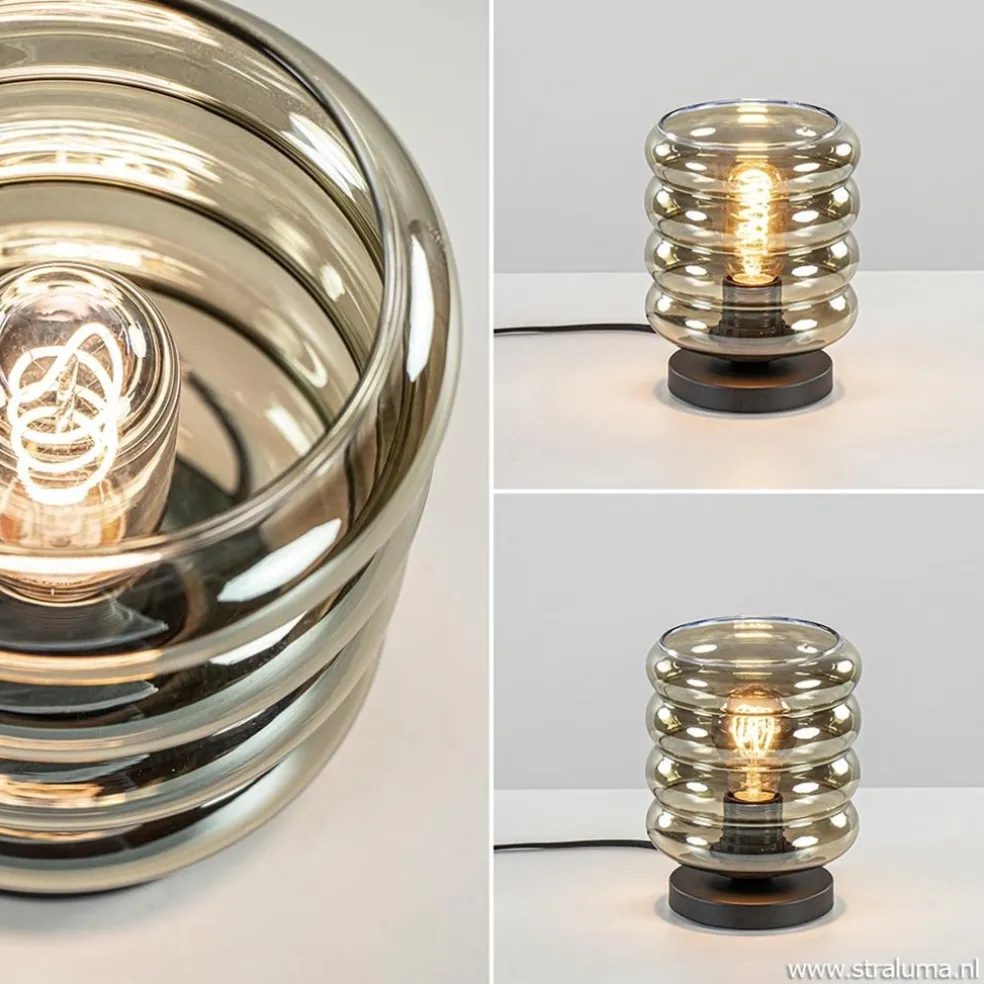 Deze moderne tafellamp is voorzien van een smoke glazen kap die zorgt voor een luxe en sfeervolle uitstraling. Het donkere glas wordt ondersteund door een kleine zwart metalen voet waarbij het glas op de fitting wordt vastgedraaid. De zwarte voet heeft een snoer van 185 cm met een schakelaar op 65 cm van de lamp. Deze smoke glazen tafellamp wordt geleverd zonder lichtbron (E27).