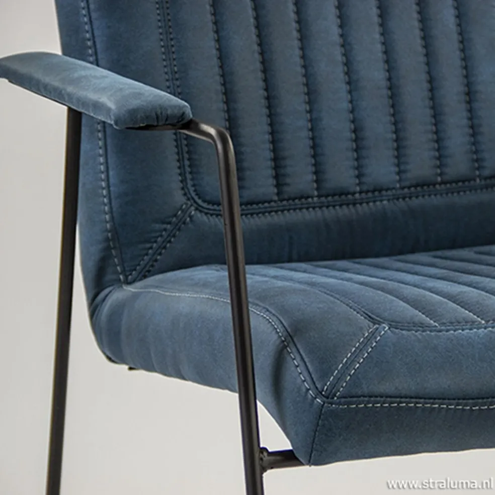 Een trendy eetkamerstoel als deze staat prachtig in een modern of design interieur. Dit is een moderne stoel, met een matzwart metalen frame, voorzien van een uniek gekruist onderstel welke overloopt in beide armleuningen. De eettafelstoel is uitgevoerd in een hoogwaardig blauw gekleurde stof en is voorzien van een subtiel stikwerk. Met deze eetkamerstoel haalt u een trendy en comfortabele stoel in huis waar u lekker lang op kunt vertoeven.