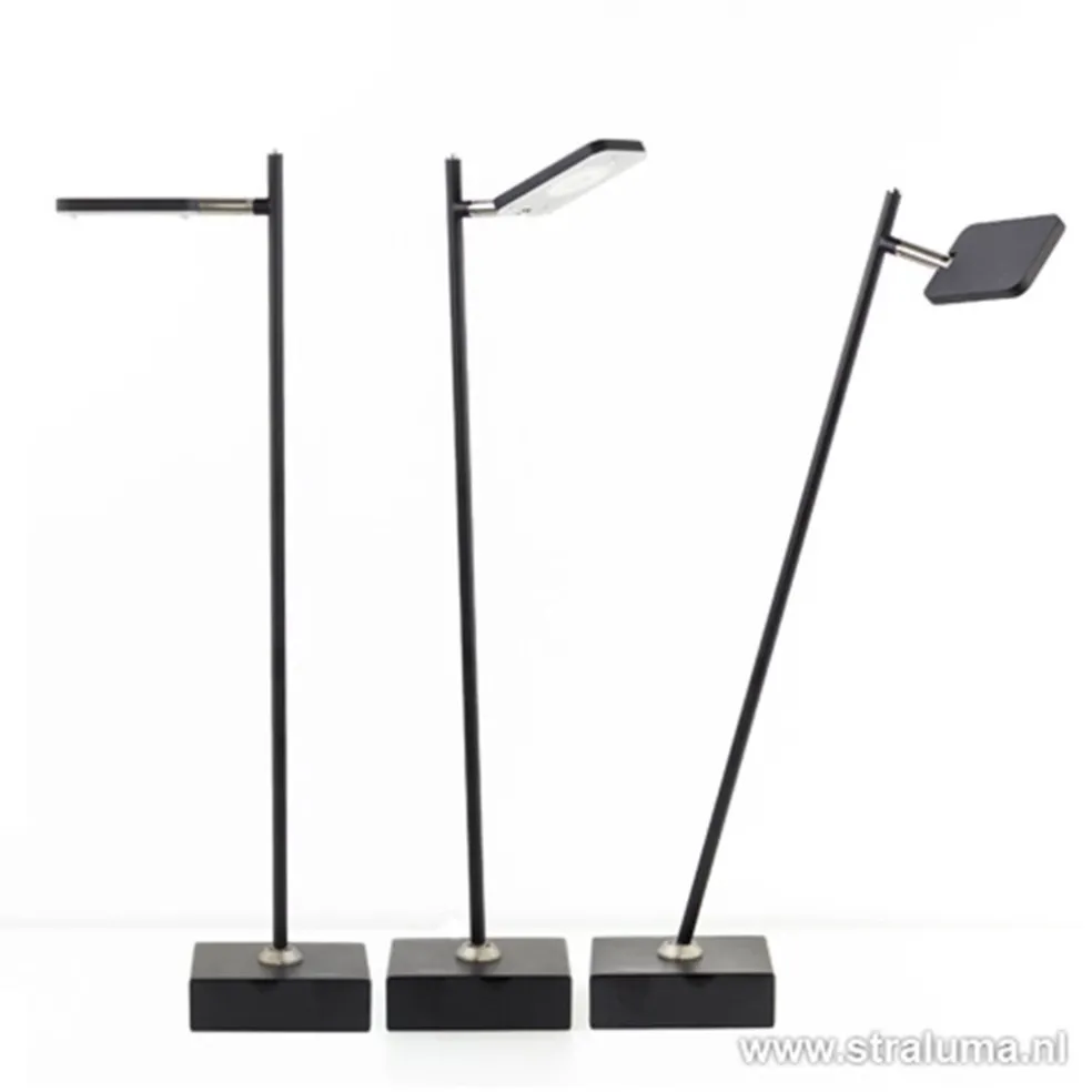 Moderne matzwarte bureau- tafellamp voorzien van rvs accenten. Door het eenvoudige design is deze tafellamp voor vele doeleinden toepasbaar. Bijvoorbeeld op een dressoir, of voor directe verlichting op een bureau of andere werkplek. De verticale stang is bevestigd d.m.v. een kogelgewrichtje op de vierkante voet. En mede door de geheel draai- en kantelbare lichtunit kunt u de leeslamp in elke gewenste stand zetten. De verticale stang is voorzien van een traploze dimfunctie. Hiermee kunt u de lichtsterkte van de led lichtbron naar behoefte bepalen. De dimmer is voorzien van een geheugen unit waardoor deze de lichtsterkte onthoudt als u de tafellamp weer aan zet.