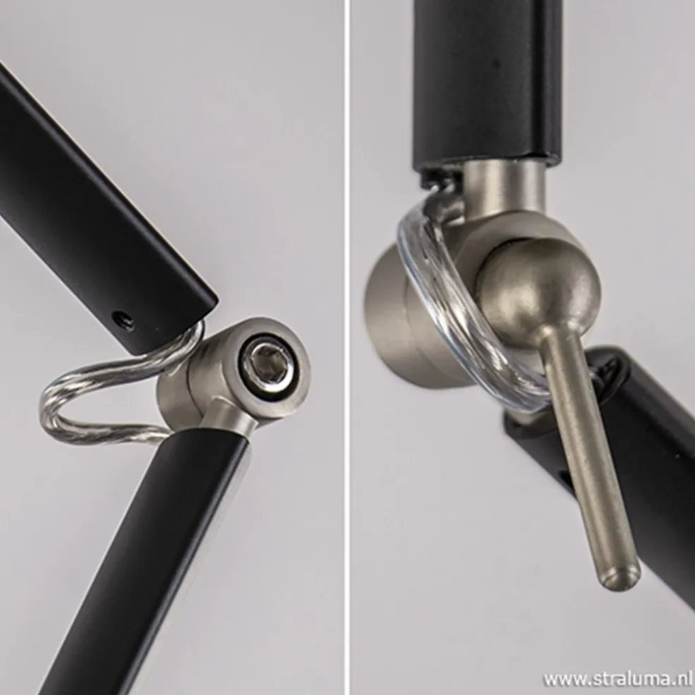 Ideaal wanneer de contactdoos in uw plafond net niet op de plek zit waar u zou willen. Deze plafondlamp zorgt ervoor dat u geen losse gootjes op het plafond hoeft te plakken. De lamp is op meerdere plekken verstelbaar zodat de kap altijd boven de gewenste plek komt te hangen. De arm is op drie plekken te verstellen en ook de grijze stoffen kap is te kantelen en te draaien. Het matte zwart in combinatie met de matte nikkel scharnierpunten geeft de lamp een strakke en moderne look waardoor de lamp mooi past in een modern of landelijk interieur.