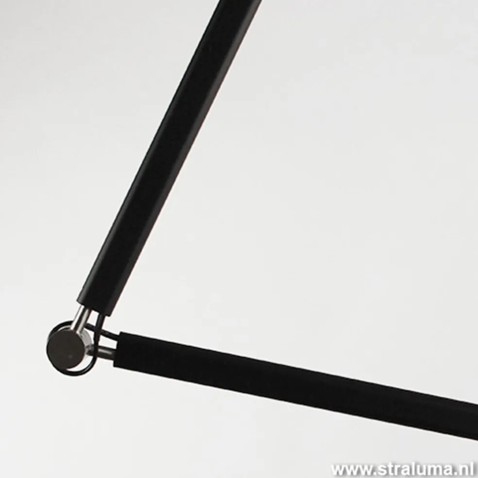Super praktische hanglamp/plafondlamp met verstelbare arm, hierdoor kunt u deze lamp naar wens verstellen. Mooi design met zwart en staal gecombineerd, dit geeft het geheel een mooie strakke uitstraling. De kap zorgt voor sfeer en een zacht tintje. Deze verstelbare plafondlamp is bij de kap en plafondbevestiging draaibaar en kantelbaar, tussen de stangen zit ook een scharnier. Door deze mogelijkheden is de lamp in allerlei houdingen in te stellen. Ideaal voor boven de eettafel.