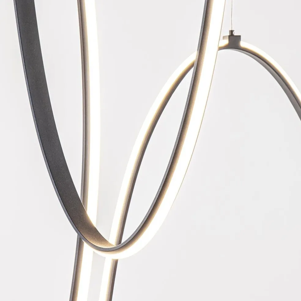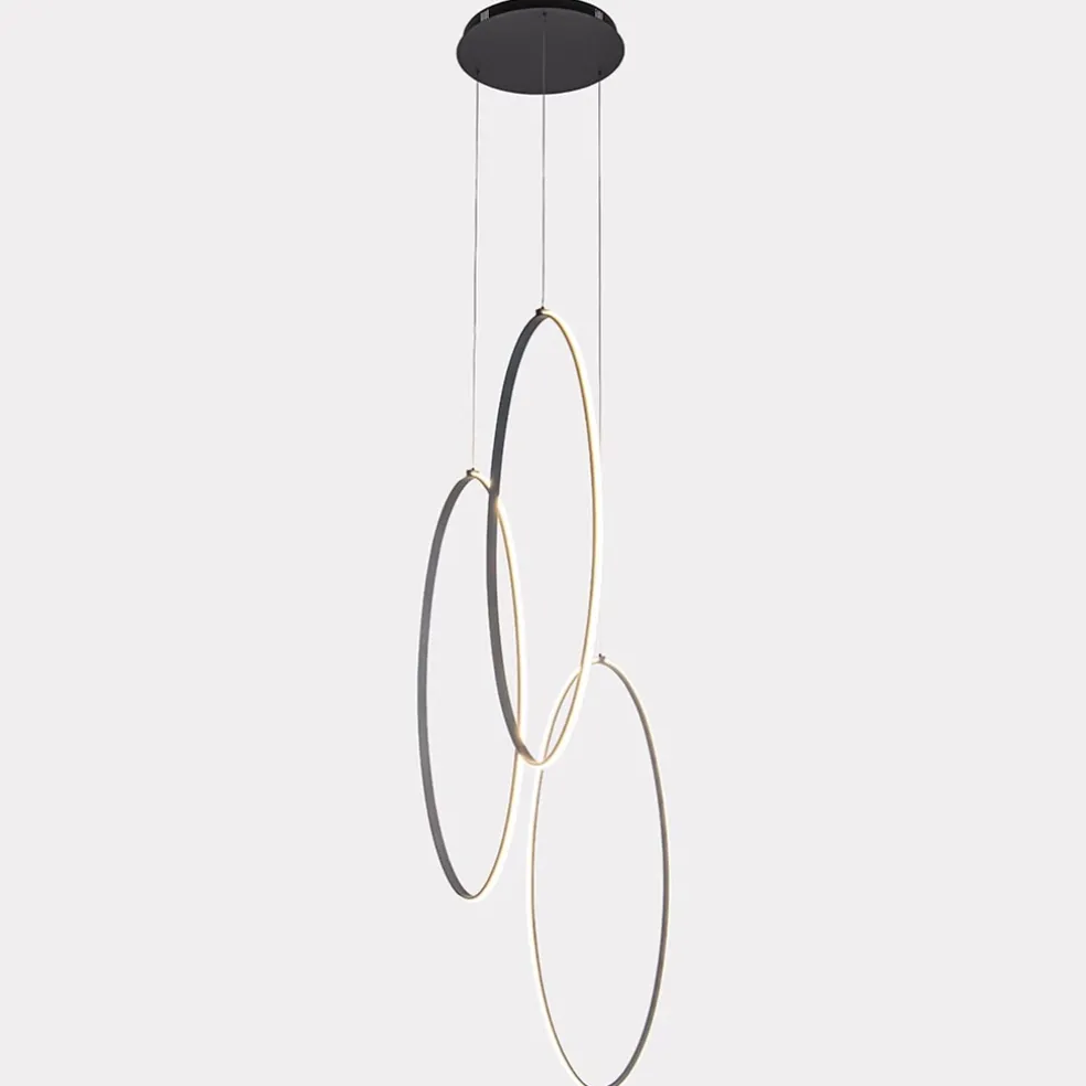 Een moderne luxe hanglamp die perfect geschikt is voor een vide. De moderne hanglamp heeft een maximale hoogte van 350 cm en is naar wens te verstellen. De lamp bestaat uit drie zwarte ovale ringen welke aan de buitenzijde zijn voorzien van een LED strip. Het LED geeft met 2700 Kelvin een sfeervolle warm witte verlichting en zorgt met 8640 lumen voor een goede lichtopbrengst. De drie ovale LED ringen zijn los van elkaar in hoogte te verstellen zodat u deze zo kunt hangen dat ze het beste in uw vide uitkomen. De zwarte hanglamp wordt met een ronde bevestiging aan het plafond opgehangen.