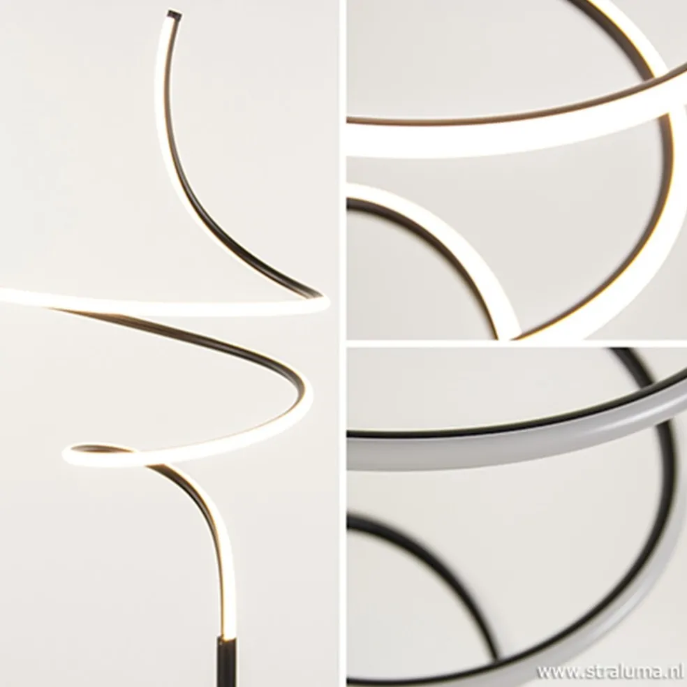 Deze moderne zwarte vloerlamp is een leuke speelse toevoeging aan het interieur. De LED lamp heeft de vorm van een krul waar de LED verlichting volledig in is verwerkt, dit geeft een mooie lichtverdeling en zorgt voor een goede sfeer. De sfeer kan extra worden bepaald door de snoerdimmer waarmee de lamp zachter kan worden gezet. Omdat er LED verlichting wordt gebruikt wordt de lamp niet warm en is deze ook nog eens energiezuinig.